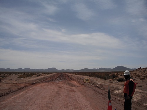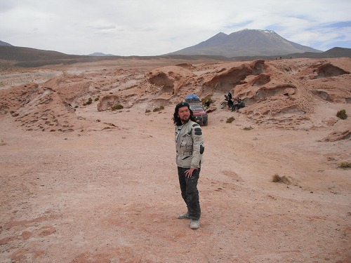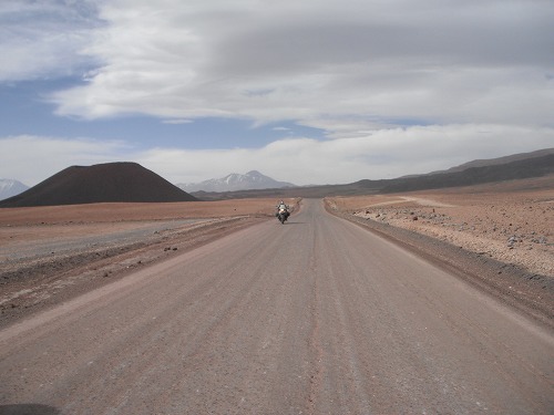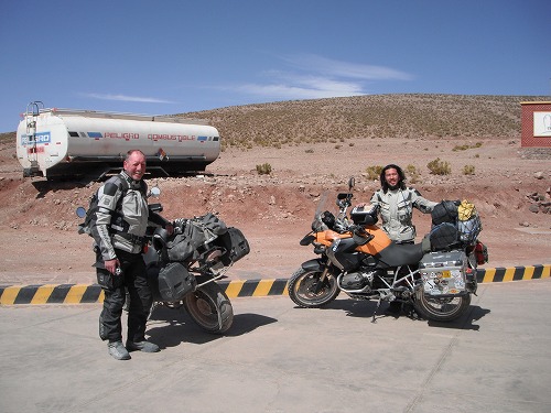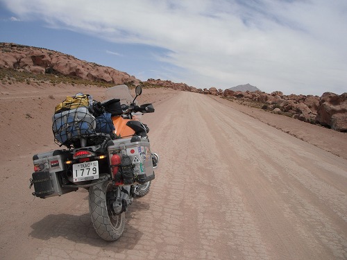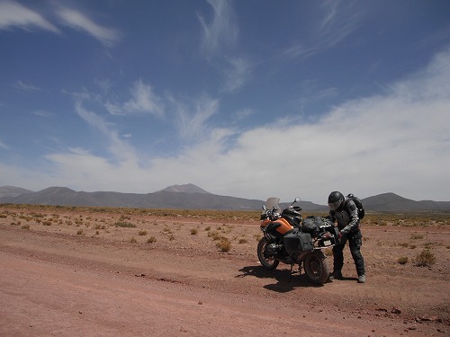 San Cristobalで給油。ここからチリのカラマまではガソリンスタンドはありません。Villa Alotaを越えた辺りで道路工事をしてました。本線は通行止めなので脇道を通ります。本線に戻ったら、水の撒き過ぎで路面がぬかるんでます。ワシが先頭を走ってましたが、ツルリ、とこけそうになりましたが、何とか持ちこたえて乾いた路面へ。後ろからフレッドが着いてきましたが、ツルリと滑ってコントロールを失い路肩へドッシャーン!と転倒!!