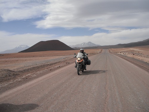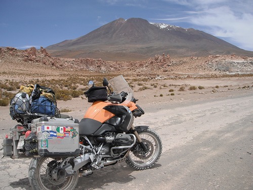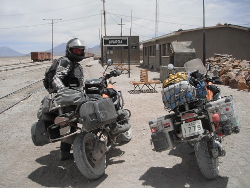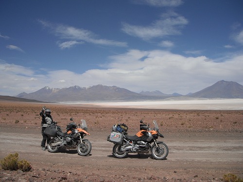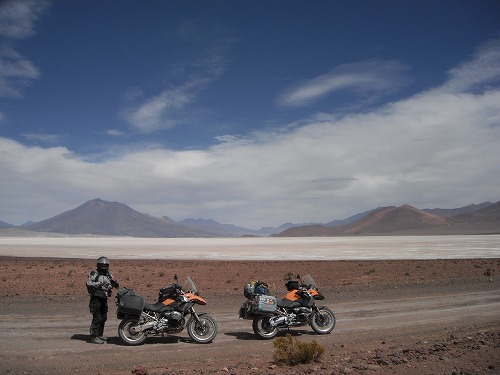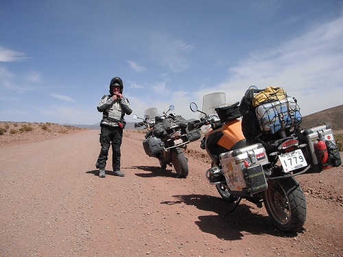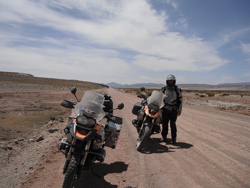 DSCF9851.jpg今日は朝9時ごろに出発しようと思っていたのですが、6時ごろに目が覚めてしまいました。ちょっとベッドの上でウダウダして、外に出るとライダーがいました。そうです、もう1つのオレンジ色のGSのオーナーです。彼はフレッド、ドイツ人。チリでGSを買って3ヶ月間でチリ、ペルー、ボリビア、アルゼンチンを旅するのだそう。「今日は何処まで?」と訊くと、「チリのカラマまで。」と言うので、同じ目的地。なので一緒に行くことに。だから出発は早めになりました。