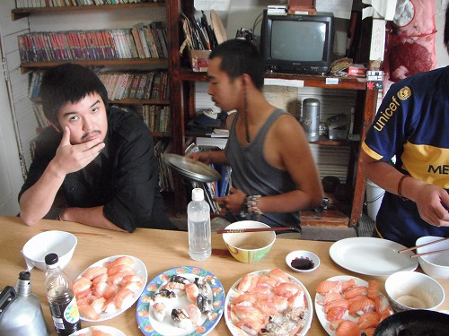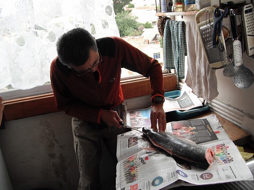 今日はサーモン入りました。丸ごと一匹3.8キロ。15,000ペソ。それにアワビ1キロ、アサリ2キロ。