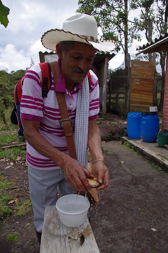 We walked across a few farms to Ernand's place. He is an artist and his house was decorated with those strange objects. He grows flowers to sell in the garden. There were lots of beautiful flowers. He changed to his walking outfit - wearing machete (a bowie knife) and carrying a traditional Colombian leather bag.