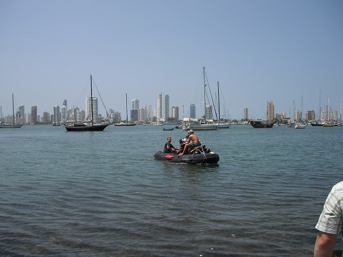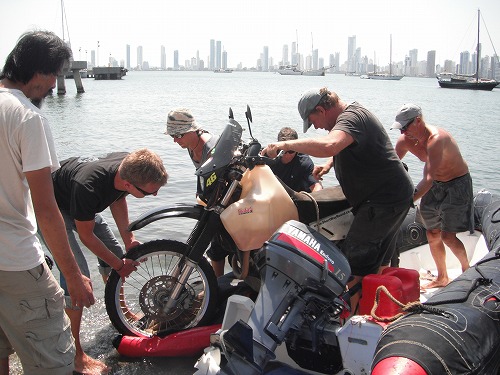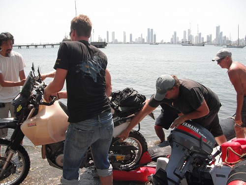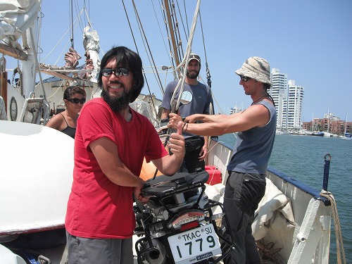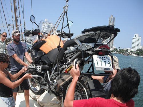 ワシのGSを小船から降ろす写真は残念ながら撮ってないので(降ろすのに忙しかったので)、アダムのバイクが降ろされる模様を載せました。まぁ、バイクを運搬するのに一番の方法ではないですが、無事にパナマからコロンビアまで運べました。エンジンも一発で掛かります!
