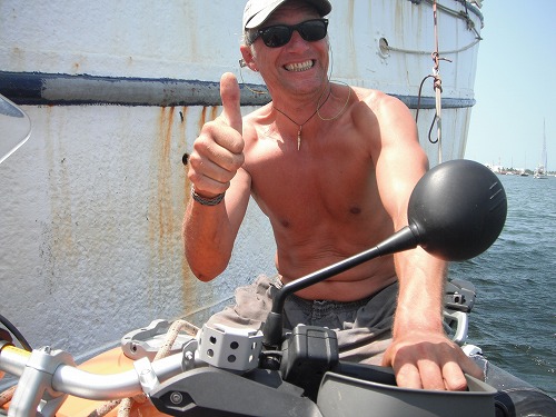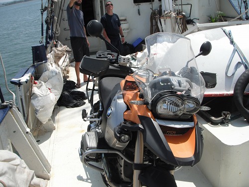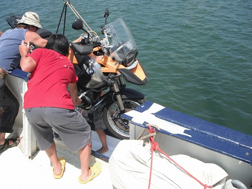 先ずはローレンのバイクを陸揚げさせて、マレーのバイク、荷物と続きます。そしてジョンのバイクが陸揚げされて、ワシの番!クレーンで船から小船に降ろし、そして桟橋へ。桟橋と言っても牽引から小船を下ろすランプなのでバイクを小船から降ろすのはそんなに難しくありません。