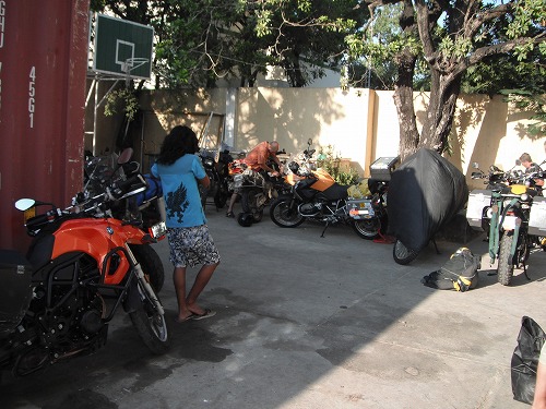 荷物が運ばれ、パニアをバイクに装着しアドゥアナ(税関)へ。そこには沢山のバイクが。建物に入るとマレーとローレンがまだいます。どうやらシステムダウンでまったくプロセスされないそうです。Wild Cardのバイク乗り達も待ってます。通関エージェントもお手上げです。仕方が無いのでバイクは税関に置いて明日朝一番で戻ってくるしかないそうです。しかしバイクをここに置くのにも許可が必要だかなんだかで、待たされました。