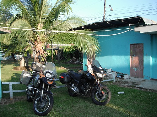 シウダー・ネリーには4時過ぎに到着。街の何キロか手前には何軒かホテルを見たのですが、街にはあまりないです。一軒見つけてウメザワさんが部屋を見に行っている間バイクを見ていると、街の人が「ここのホテルは危険だから、他のホテルにしなさい。」と教えてくれて、しかも自転車で先導してくれました。 我々が宿泊してるホテル・エル・ランチョは一部屋16ドル。エアコンは無いですが、まあイイでしょう。エアコン喉によくないし。