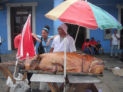 TomとTokoちゃんは自前のインスタントラーメンを昼飯にするとのことなので、ローラとワシはカーニバルへ!宿のお母さんに「露店の食べ物は何日も前から用意されたものもあるから食べないほうが良いわよ」といわれていたのにも係らず豚の丸焼きを見た瞬間そんな忠告も忘れてしまいました。なんたって謝肉祭ですからね!ローラも「食べないほうが良いんじゃないの?」って言いましたが丸焼き肉が入ったサンドイッチ10CUP購入。脂っこいですが美味いです。これが後で大変なことになるとは・・・。