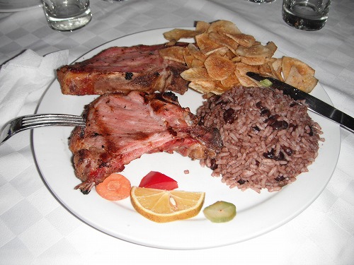 夜は宿のレストランで夕食。宿の情報ノートにも「ここの料理は絶品!」と多数書かれているのでちょっと奮発してみました(ドリンク付きで7CUC)。ボリュームもあるし美味しかったです、が絶賛するほどでは・・・。レストランは何組かのお客が入ってますしそこそこ人気なのでしょう。