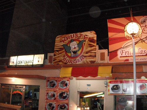 7時になったのでジミーたちとの待ち合わせ場所に。何を食べようか?ということになりピザがいいとなりましたがピザ高いです。歩いてると雨がちらほら。クラスティー・バーガー(シンプソンズに出てくるバーガー屋)があったので入ってみると、バーガーは無くフライドチキンとポテトだけ…。そとには写真付でいろいろメニューあるじゃん…。