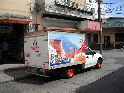 近くのフライドチキン屋でテイクアウェイをして昼飯。21Qで大きなチキン2ピースにチップスとコールスロー付き。大体メキシコと同じくらいの値段ですね。なんとBIMBOの車発見!「Para Guatmala」なんて書いてありますが、メキシコの会社です。中米を席巻しています、BIMBO。白い悪魔です。