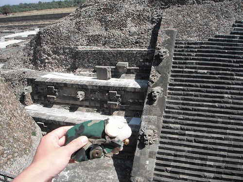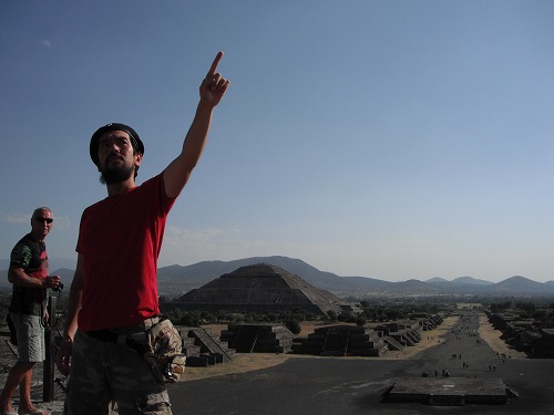 テオティワカンへのバスは35ペソ、1時間くらいで到着。 とうとう憧れのテオティワカンにやった来ました!日差しがキツイですね。最初はケツアルコアトルの神殿から攻めてしました。興奮しながら階段を上がって行きます。あ、あれがケツアルコアトル(羽の生えた蛇)の頭ですね。ようやくこの目で見る事が出来ました。ナオは「テオティワカンを全力疾走!」というムービーを作ろうと全力疾走してましたが、空気が薄いせいか、途中で頭痛と吐き気がしてへたれて止めてしまいました。