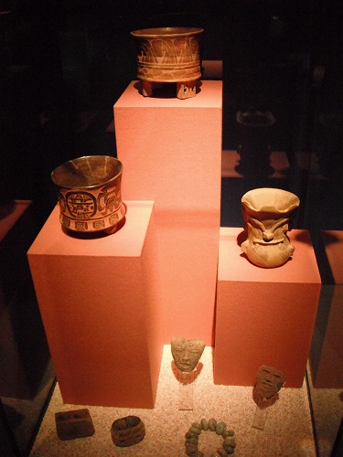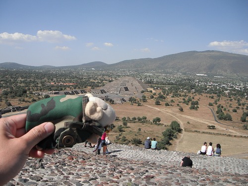 それから博物館で出土品を見て回りました。 それから太陽のピラミッドへ。バートレスが修復してかなりメチャクチャになったとは聞いていましたが、うーん、なんか修復がコンクリートで固めただけ?で雰囲気ぶち壊しです。一応一番上まで登りました。空気が薄いせいか登りで息が切れます。見晴らしは最高!でも、コンクリートが目について悲しい気持ちになってしまいます。