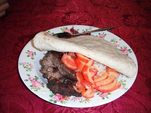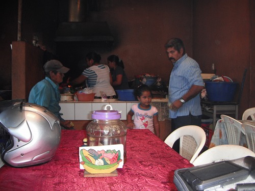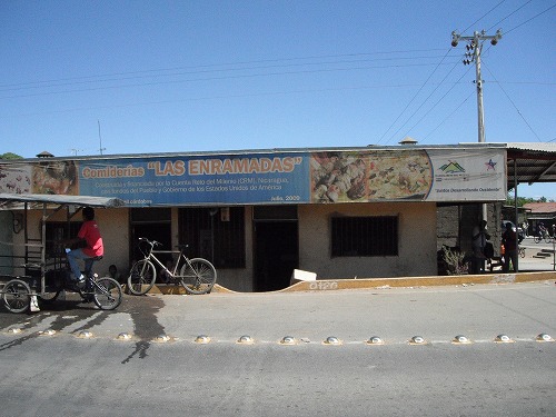ニカラグアに入ったら道が綺麗になりました。国境から最初の街で昼メシ。バイクを停めたら、周りの人の注目の的。チョットした有名人気分です。食堂でカルネアサーダ(焼肉定食)を頼みます。肉は硬かったですが味はヨシ。米が大盛りで付け合わせと言うよりも主食みたいです。ファンタを付けて40コルドバ。2ドル以下です。安い。