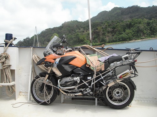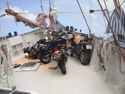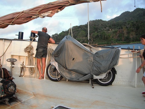 1,2の3で我がGSが宙に浮き、小船へ。小船に乗ったらGSに跨りブレーキを握って動かないように。でもワシ足が短いのでちょっと揺れるとやばい!そこでアメリカ人のダニーが後ろを支えてくれることに!ありがとうダニー!彼も背が小さいのでワシの痛みがわかるそうです。