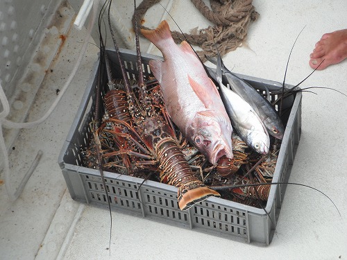 小船に乗り込み我等が船まで。夕飯のロブスターに魚がデカイの3匹。うーん、豪快だ!!