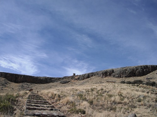 それからクティンボ遺跡へ。プーノから20キロ。テーブル上の山の上に石塔が見えます。