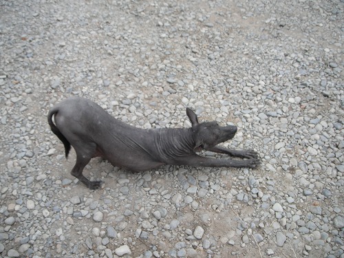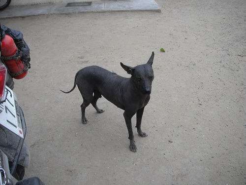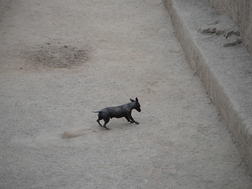 ペルー特有の毛の無い犬がいます。あまり可愛くない・・・。右の写真は糞をしたあと砂をかける毛の無い犬です(神殿の上から撮影)。