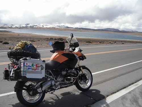 しばらく走ると氷河を頂いた山々が見えてきました。そして湖が!! GPSで高度を見ると4,431mとありました。富士山よりも700メートル上ですね。寒いわけだ。風も強いし。生憎天気悪し。