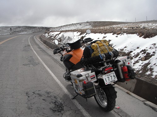 それから残雪がチラホラ路肩にある地帯へ。高度を見たら4,541m!! スゴイな。それからちょっと上がりましたので最高点は4,600メートルくらいだと思います。