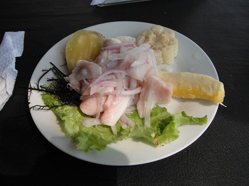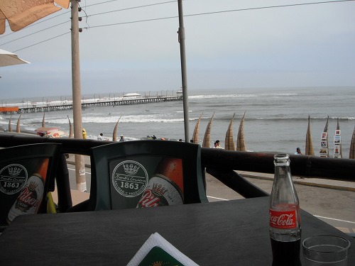 海岸沿いのレストランでセビッチェと魚介のチャーハンを。コーラ付きで10ソルです。セビッチェはホルへ・ファンの家で食べたのですがペルー風のセビッチェは初めてです。生魚をライムに漬けてある感じですね。味は?うーん、まぁまぁ。やはり刺身やしめ鯖のほうが美味いですね。魚介のチャーハンは美味かったですよ。
