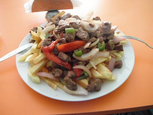 Huallancaという街で昼飯。またロモ・ソルタードを頼みました。そしたら山盛り3人前はあります。頑張って肉と野菜は食べきりましたが、ポテトは残してしまいました・・・。値段は15ソル!!高い!!けど量が多いので当然か。というか、1人前で5ソルにしてくれよ。