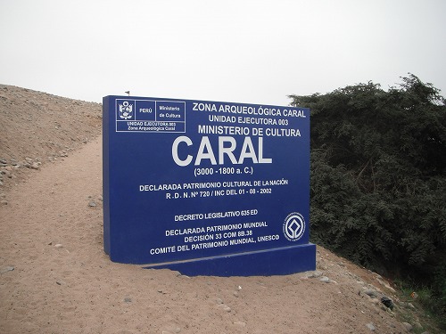 スペ(Supe)という街から左折。しばらくダート(といっても硬いダートなので舗装路と変わりありません)を走ります。カラルの村から右折。しばらくダートを走り橋を越えて遺跡の入り口へ。ユネスコの世界遺産とありますな。