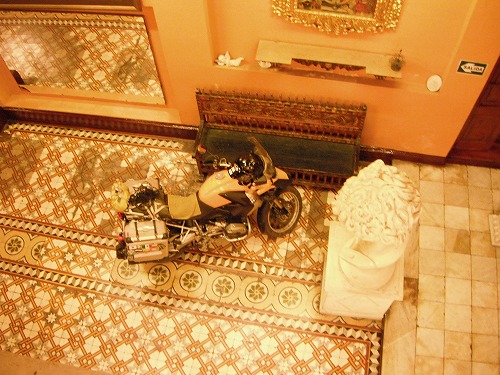 Finally I arrived at Hotel Espana, where Kaoru and Adam told me I could park my GS in the lobby. The dorm cost 20 Soles a night. It was a mansion renovated to a hostel, so the building itself was very interesting. From the upstair of the hostel, I could see the cathedral and the cross on the top of the hill. Nice.
