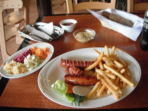 I had dinner at the restaurant down stair. I wanted to have Polsh potato dumplings "Pyzy", but it wasn't available tday... So I had sausages with French fries and salad. With a drink it cost 24.50PLN (US$7.50).