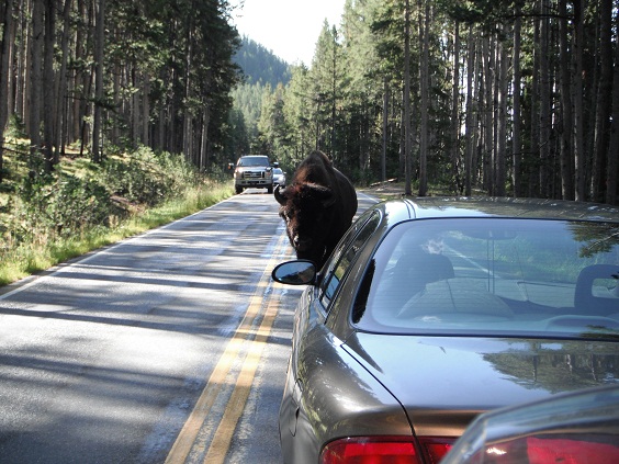 Just before the exit if the park, a big bull bison was walking in the middle of the road. He just walked pass beside me. Was little scary.