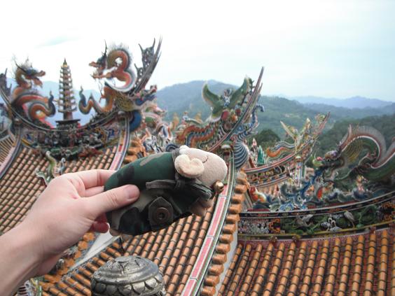 ここでようやく山歩きです。でも暑い!蒸し暑い!この気温での山歩きはきついです。でもまぁ行程は1kmくらいですから楽なもんです。台湾の緑は深いですね。日本の山線に似てるんですけど、植物の濃さっていうんですか、鬱蒼と茂っているっていうか、あーやっぱ南国だなぁ、って感じます。ヒツジさんも相変わらずアーミージャケットを着たままなので暑くてかなわないそうです。ちょっとかわいそう。