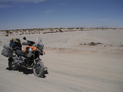 THen we entered the salt flat. The edge of the salt flat would be always wet, but it was not as wet as 2 months ago. But there were some wet spot and pot holes filled with salt water, so I rode slowly and carefully not to splash salt water to my GS.