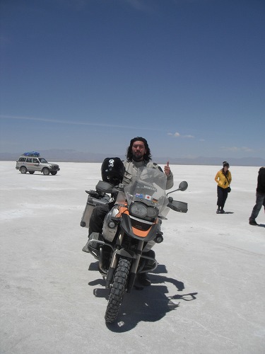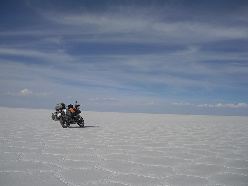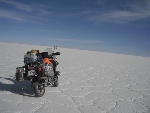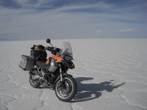 Then we came to the dry surface of the flat. We drove to the "Salt Hotel". Every where was white. It was exceptional feeling riding on the salt flat with own GS!!