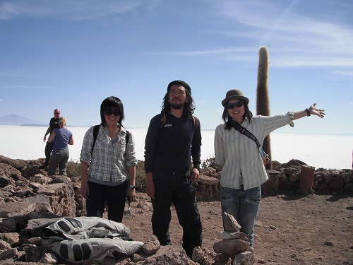 At the salt hotel, a Bolivian band was making their PV. Many tourists came to chat with me. Rika will stay a night at the salt hotel, so we said good-bye to her there.