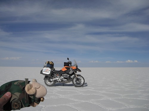 So I head back to Colchani. On the way back, I took many photos of my GS on the salt flat. Mr. Sheep was also happy to be on the flat again.