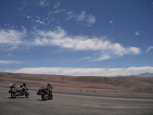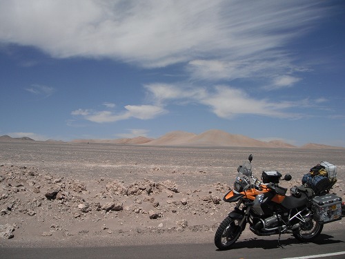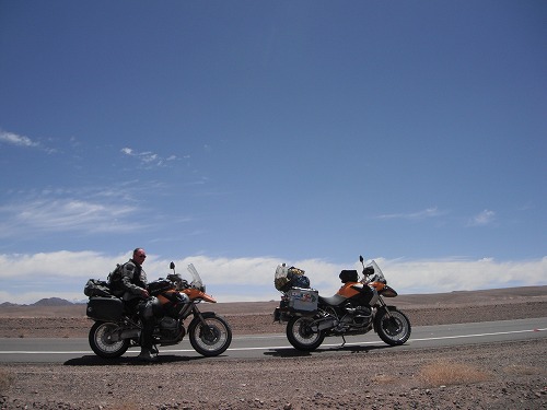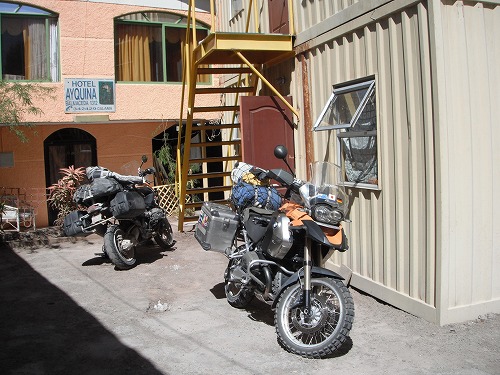 今日は朝9時ごろに出発しようと思っていたのですが、6時ごろに目が覚めてしまいました。ちょっとベッドの上でウダウダして、外に出るとライダーがいました。そうです、もう1つのオレンジ色のGSのオーナーです。彼はフレッド、ドイツ人。チリでGSを買って3ヶ月間でチリ、ペルー、ボリビア、アルゼンチンを旅するのだそう。「今日は何処まで?」と訊くと、「チリのカラマまで。」と言うので、同じ目的地。なので一緒に行くことに。だから出発は早めになりました。