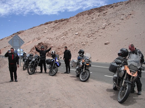 更に進むと岩がちの土地になり、いい風景だ。サンペドロに入る手前で、車やバイクが停まっているのでそこに停まってみました。風化した岩がイイ味出してます。(Valle del Muertos) 4台のYAMAHA XT660Rがいました。彼らはブラジルから来たとのこと。ダニエルもそういえばブラジルではXT660Rに乗ってるとか。ブラジルでは人気なんですね。