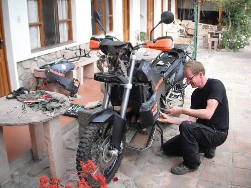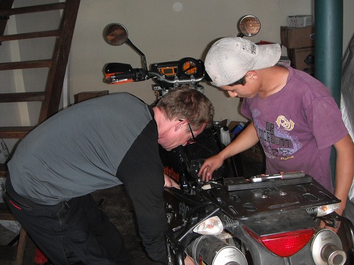 The shock was put back in place and the rear wheel was fitted. Now he had to go back to the hostel to bolt on those panels and head lights. Then he would be ready to take off!