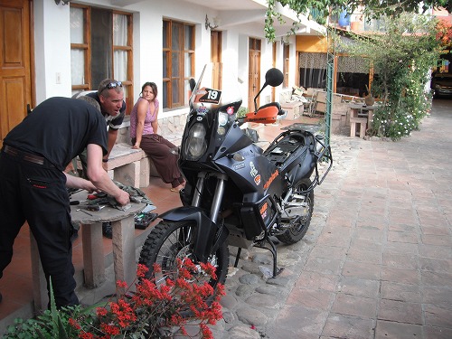This morning, Norman left to Potosi. I checked e-mails but there was no reply from Carlos of Motouring Chile. So I called him from the phone booth, but he was not in yet... I just wanted to make sure if the shock absorber was shipped out from Germany as scheduled, so that I can plan my trip to Chile. Very frustrating situation indeed.