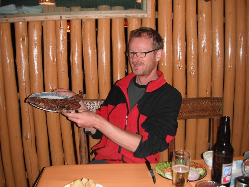 to cokk rear, and it was perfectly cooked rear. As I heard from many travellers went to Argentina that steaks there were not very good and expensive, so it was good idea to have good steaks while in Bolivia. We talked about Whaling, life in Esat Germany period, what Hitler would have aimed / achieved if he did not fail, and so on. It was really good dinner.
