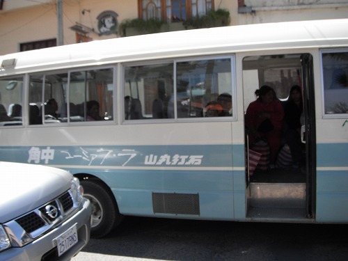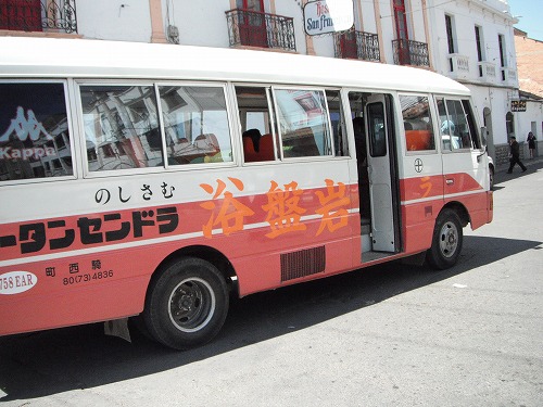 朝はのんびりと。ウベとメルカドで昼飯、そして郵便局。まだ届いていない、と。今日のおばちゃん曰く「国際便は月曜日と火曜日しか届かないわよ。」とのこと。早くそれを教えてくれよ。ということは、プランBの発動は火曜日以降ということですか。写真はスクレ市民の足、温泉バスと石打丸山です。石打丸山って地名かな?? しかし、どうやってオリジナルのペイントをそのままに自動ドアを左側から右側に換えたのだろう??