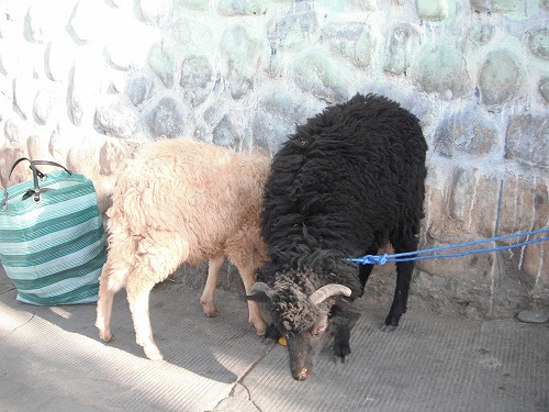 夕方バレーボールに行こうとしましたが、場所を忘れてしまい、ウベとタイヤを探しに。考えてみれば土曜日なので、店は全部閉まってましたが。バス・ターミナルの近くで黒と白の羊さんに遭遇。