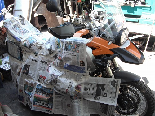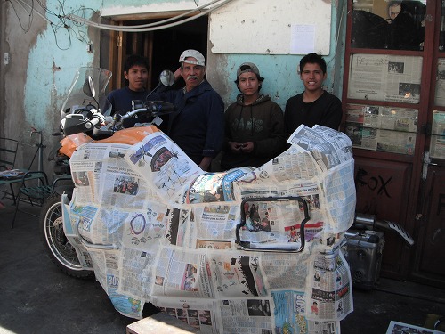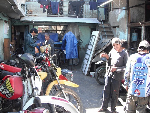 9時過ぎに宿を出発。「Motoservi」に到着したら丁度ハイメさんが出かけるところ。「今日は予定が詰まっているけど、オイルシール交換とオイル再注入だね。問題ないよ。2-3日で出来るよ。」と頼もしい返答。とりあえずワシの詳細を記入して、また右パニアの修理も頼みました(ラパスで修理しましたが、閉まりが悪いもので)。ハイメさん曰く「いつでも遊びに来ていいよ。」と。