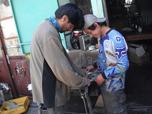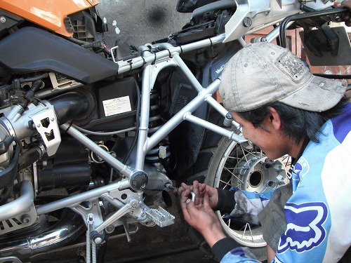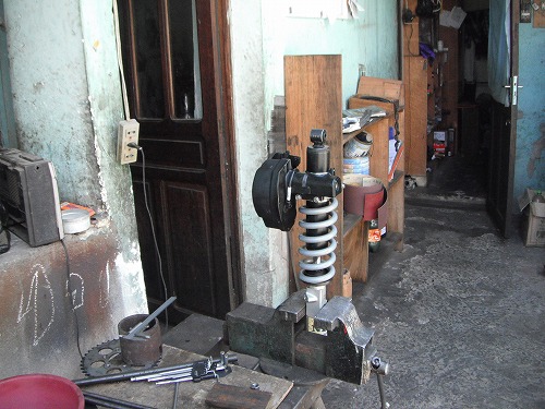 9時になったので「Motoservi」へ。ESAが付いているのでショックからバネを取るのに苦労。特別な「工具」を一から作ります。流石ボリビア。なんだかんだで「工具」が出来たのは11時半ごろ。それからショックからバネを取り出す作業に入ります。