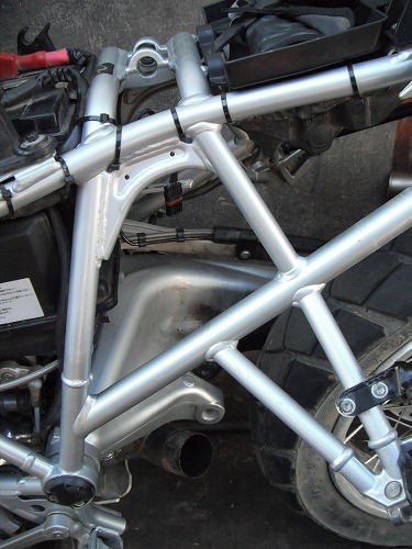 乾くのを待ってパニア・フレーム取り付け部やサブフレームなど細かい部分はブラシで手塗り。12時過ぎには仕上がりました。エンジン・バーのオリジナルの色と今回使った色は若干違うので、マスキングされていた部分と塗りなおした部分とでムラがありますが、まぁ、いいでしょう。これでウユニの塩害対策はバッチリです!? マスキングをするのにずっと屈んでたのでエラく疲れました。