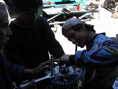 3時過ぎに再び「Motoservi」を訪ねると若い衆が丁度リア・ショックを取り外しているところでした。スイング・アームとの取り付けネジが硬くてなかなか外れません。恐らくネジロックがしてあるのでしょう。