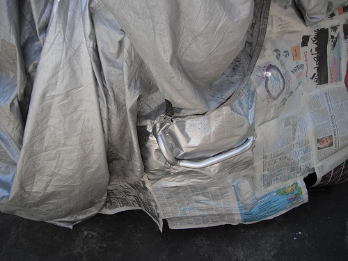 放課後一旦宿に戻り、売り手からの連絡を確認しようとしましたが、まだ無し。「Motoservi」に戻り、新聞紙を使ってマスキング。しかし範囲が広いし、ただ単に新聞紙を被せるだけじゃないので結構時間がかかりました。6時に始めて片側が終わったのは8時前。明日は片側を塗ったら反対側にマスキングして塗る、という感じになりそうですね。