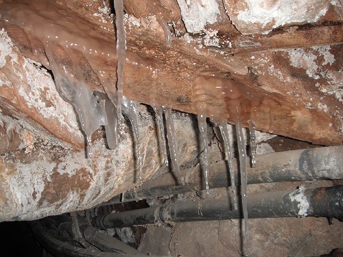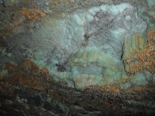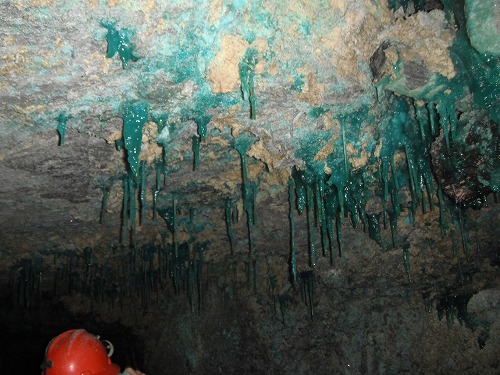 更に進み梯子を登って、また進みます。この辺になると「早く外に出たい」と思ってましたね。途中緑色のツララ(硫化銅)や真っ青な結晶とかありました。