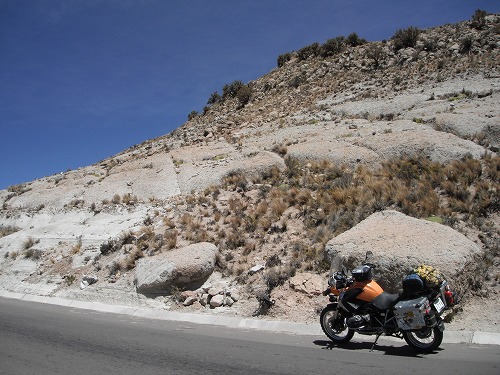 彼とメール交換したり、GPSマップをもらったりしてたら10時過ぎ。ステファン曰く「オイルが滲み出てるくらいだったら、ダストがシールのところに詰まってるだけだよ。俺のフロント・フォークは5,000キロ以上オイル漏れてる状態だよ!!」と。まぁ、次のBMWディーラーが在るアルゼンチン北部の街トゥクマンまでそんなに距離は無いですし、道も悪いところはウユニから塩原にはいる街コルチャニまでなので様子を見ながら走りますか。