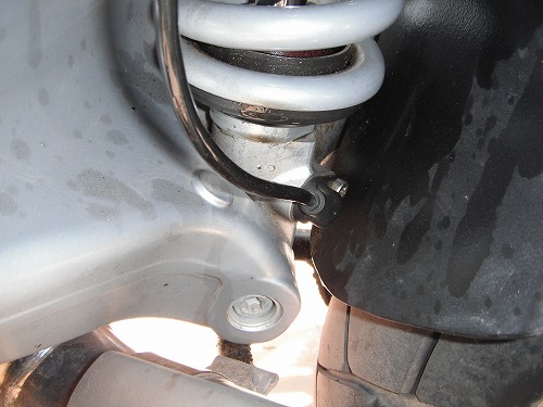 しばらくワインディングを走ります。40キロくらい走ったところで、見晴らしが良くて路肩に停めやすいところがあったので写真撮影。リア・ショックを見たら、なんと!! オイルが漏れているではないですか!!滲み出るってどころか、完全に滴ってます。
