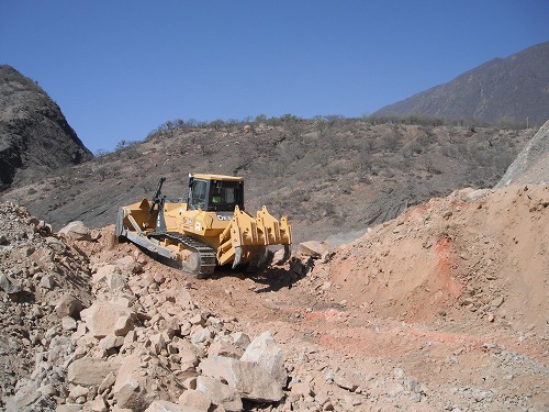 なんと、大きくガレていて、しかもフカフカ。リア・タイヤはツーランすなのでグリップしてくれません。下手にアクセルを吹かすとノッキング、クラッチ操作が難しい。ちょっと焦げ臭い・・・。あー、クラッチが焼けてしまう、と思ったらポテゴケ。一大事!!と、おもいきや、ちょっと先にブルドーザーが作業中。