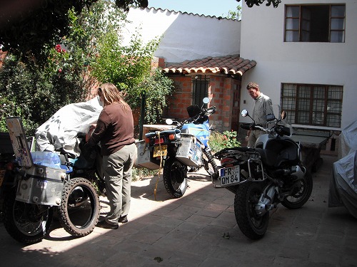 スクレには4時半ごろ到着。昼飯食べてないので腹減りまくり。目的の宿パチャママ(Hostal Pachamama)は直ぐにわかりました。中に入るとマーク&クレアが!! 再会を祝します。エスペランサが埃まみれなので、「珍しい」とクレアが写真をパシャリ。いつも汚れると直ぐに拭いてしまうので。