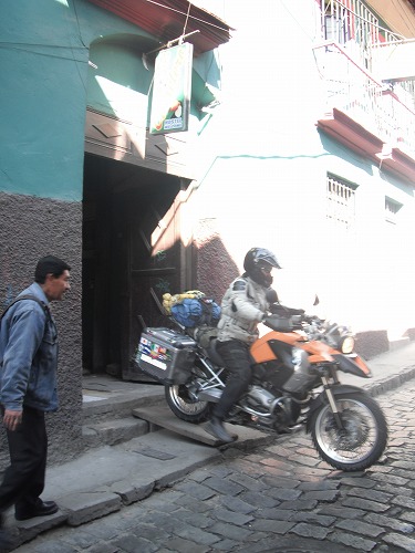 石畳舗装になり、逆に走りにくい。街まで登りましたが、宿探しに苦労。プラザの前の宿は中庭にバイクを駐車できるのですが、部屋が空いていないと…。
